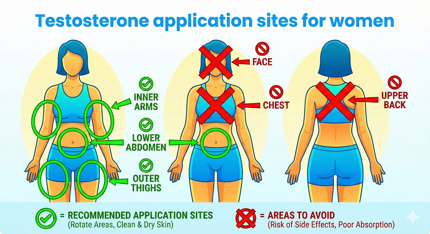 The tip: Not all skin is created equal when it comes to converting testosterone to DHT. Apply to low-sebaceous areas (inner arms, lower abdomen, outer thighs) to minimize side effects. Avoid high-sebaceous areas (genitals, face, chest, upper back).
