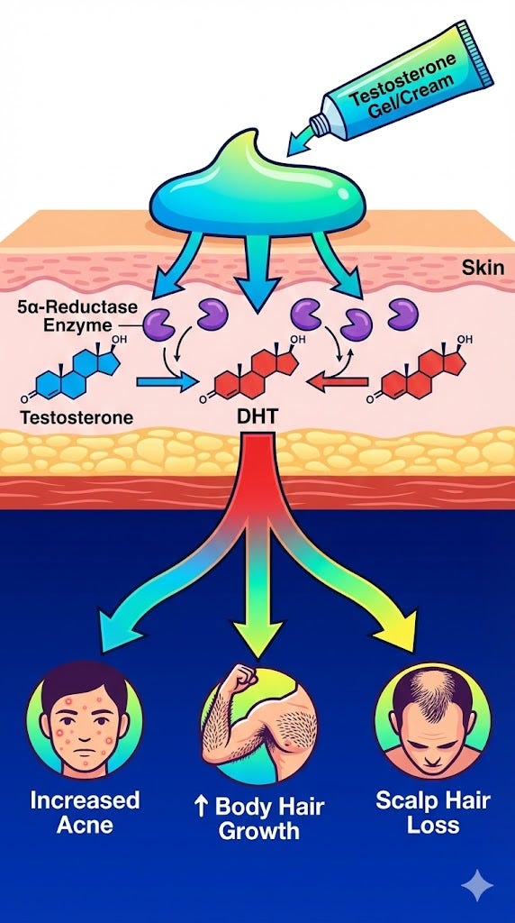 Here’s where route matters: in men, transdermal testosterone (gels and creams) increases DHT about 5.5-fold, whereas intramuscular injections increase DHT only about 2.2-fold at similar testosterone levels (Borst, 2015).