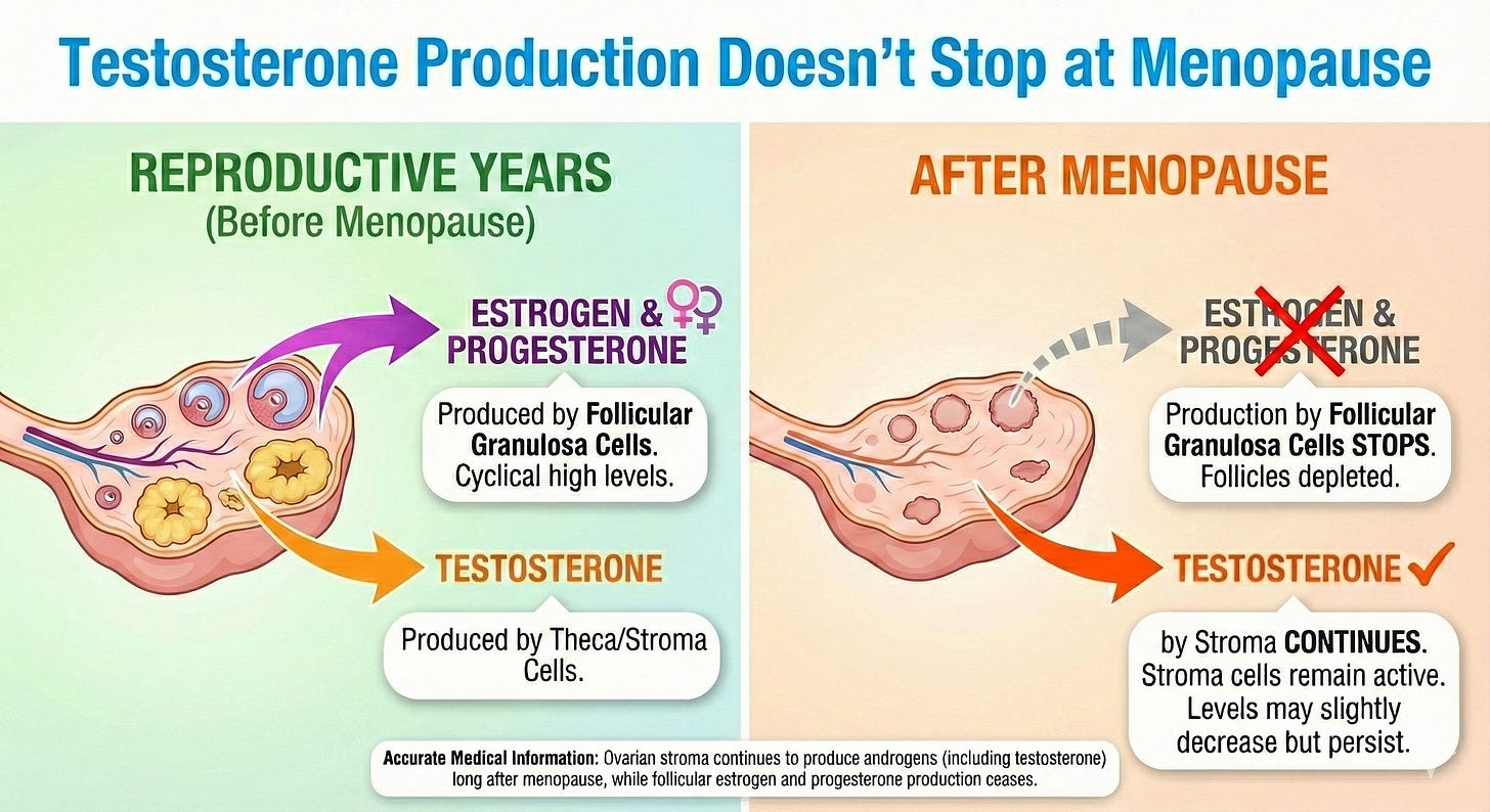 Why this matters: This is one of the most misunderstood things about testosterone therapy in women. Unlike estradiol and progesterone, which drop sharply at menopause when your ovaries stop ovulating, testosterone doesn’t fall off a cliff.
